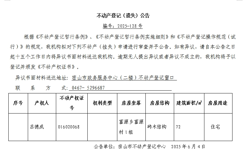 不动产登记(遗失)公告编号:2025-吕德成