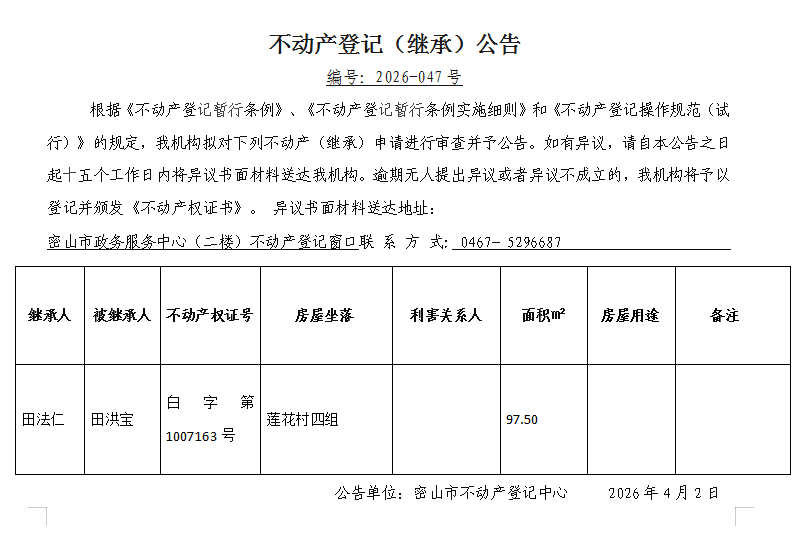 不动产登记(继承)公告编号:2026-田法仁