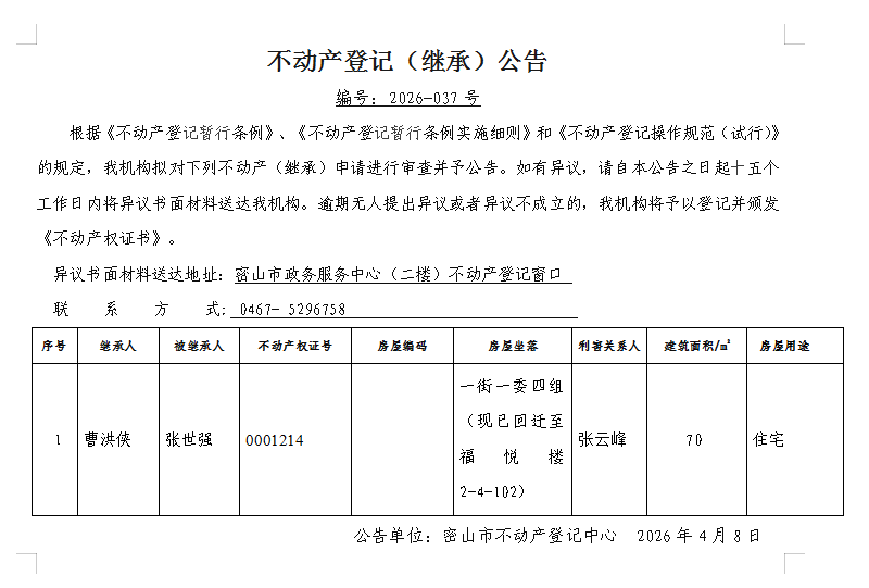 不动产登记(继承)公告编号:2026-曹洪侠