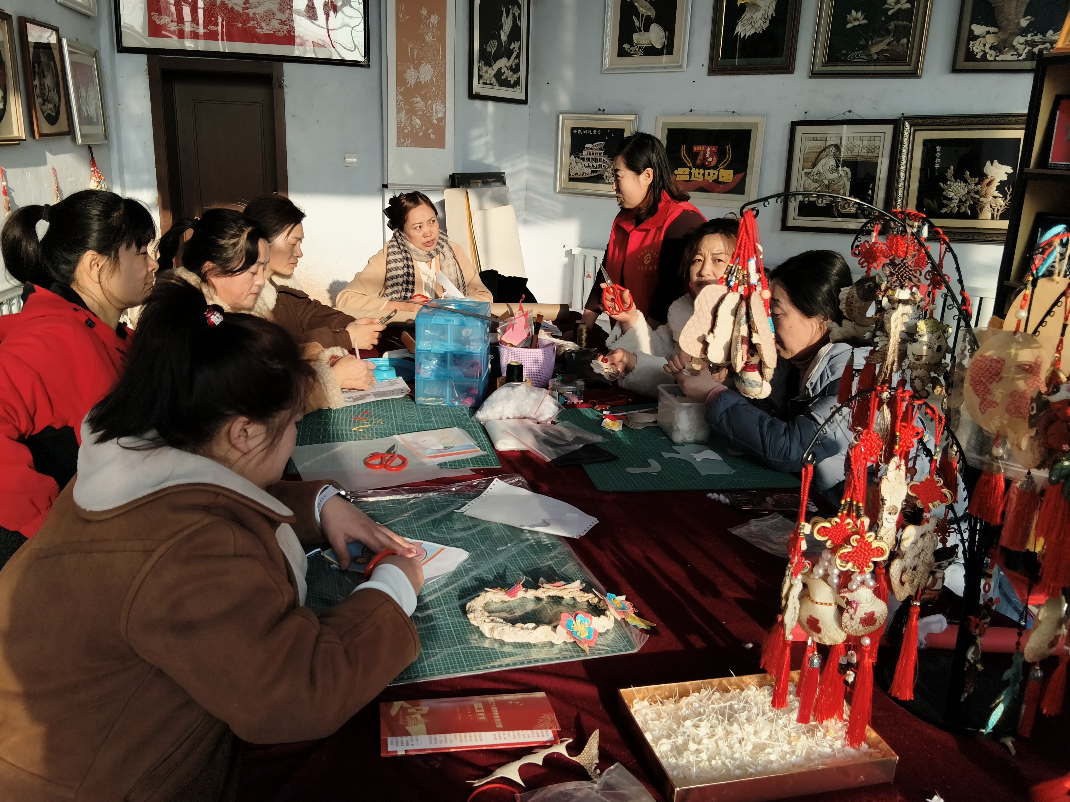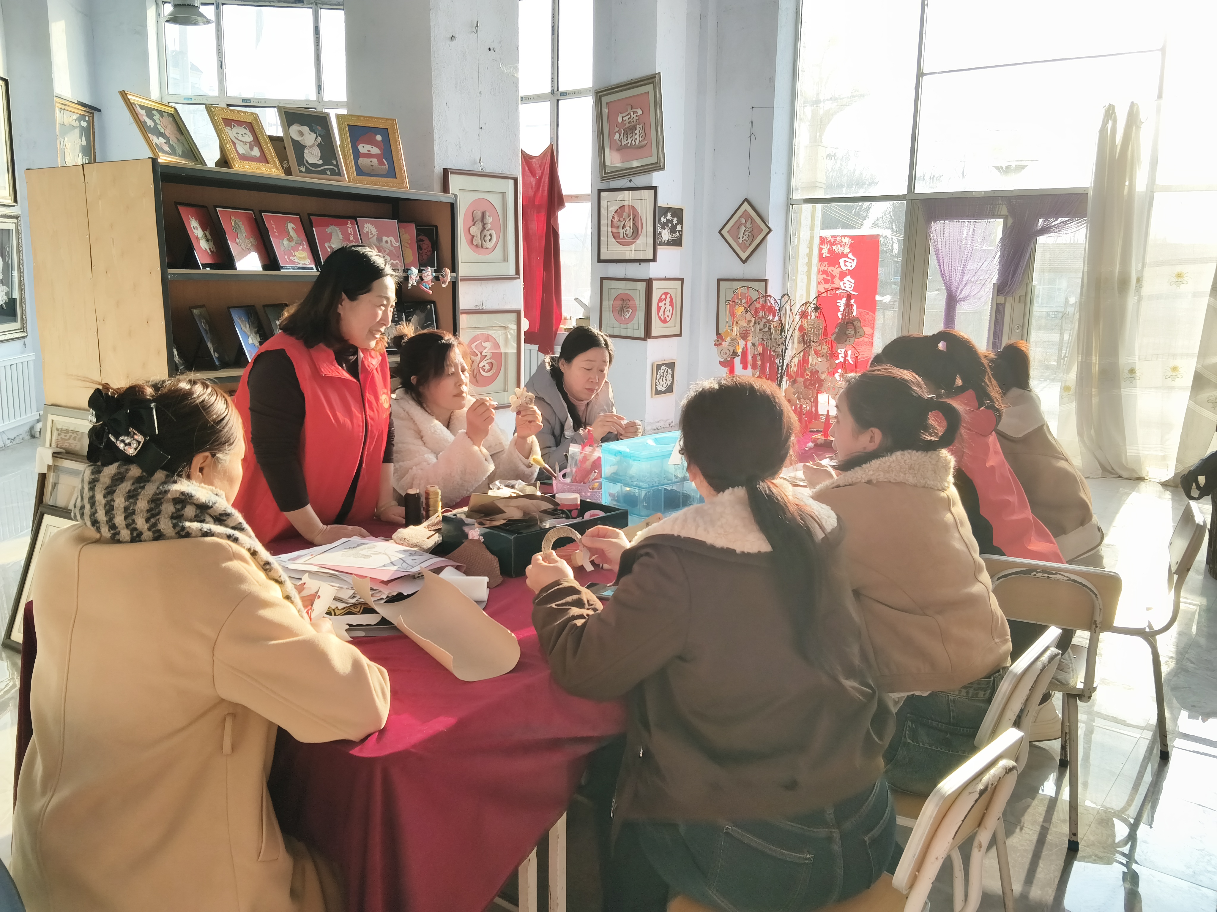 活动特别邀请了鱼皮画非遗技艺传承人李华现场授课指导。现场氛围热烈而温馨,大家手持鱼皮、剪刀、胶水等工具,在老师的耐心指导下,从勾勒轮廓到裁剪鱼皮,从精心拼贴到细节修饰,一步步认真创作。虽然不少人是初次接触鱼皮画制作,手法略显生疏,但大家相互交流、彼此探讨,充分发挥想象力和创造力,将一块块色彩、纹路独特的鱼皮,变成了一幅幅造型精美、各具特色的鱼皮画作品。灵动的花鸟、鲜活的鱼虾、吉祥的图案跃然纸上,每一件作品都饱含着大家的巧思与心意。此次以“三八”妇女节为契机开展的鱼皮画制作活动,不仅让白鱼湾镇的妇女同胞们度过了一个欢乐、充实、有意义的节日,展现了新时代巾帼女性积极向上、热爱生活的精神风貌,更让兴凯湖渔猎文化在动手实践中得到传承与传播。