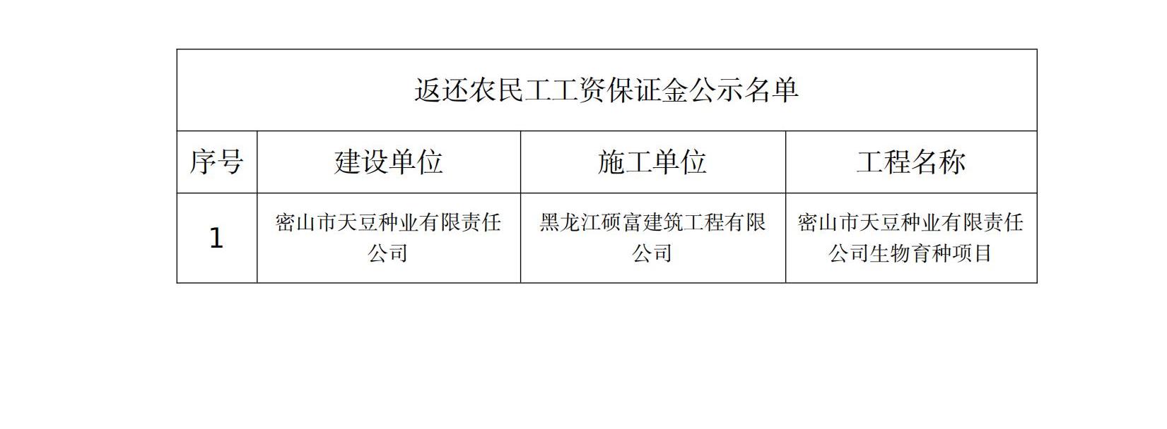 根据《工程建设领域农民工工资保证金规定》(人社部发〔2021〕65号)文件要求,现对返还农民工工资保证金的1个工程进行公示,如工程项目中有存在拖欠农民工工资行为的,请及时到密山市人力资源和社会保障局劳动监察部门举报投诉。公示期满,如不存在工资拖欠问题投诉举报的,密山市人力资源和社会保障局将按规定程序返还农民工工资保证金。