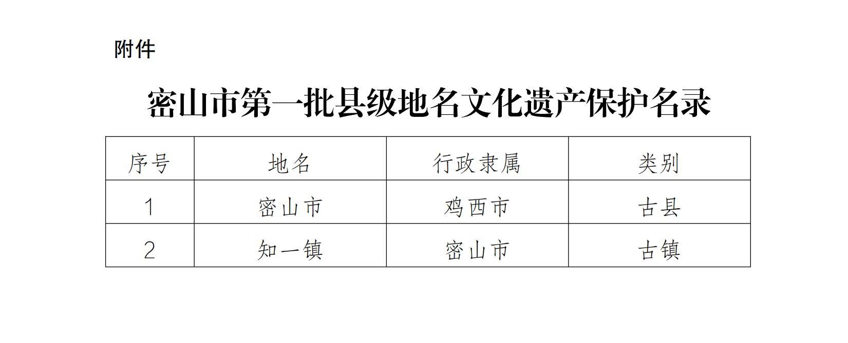 为深入贯彻落实《地名管理条例》及其实施办法,传承弘扬密山市优秀地名文化,进一步建立健全密山市地名文化遗产名录体系,加强地名文化遗产保护传承工作,按照《鸡西市县级地名文化遗产保护名录申报评定工作实施方案》要求,依各乡(镇)推荐申报,经密山市民政局调研评估、组织专家评审、征求市直有关部门意见等多个环节择优认定,拟将下列2个地名(名单附后)列入第一批密山市县级地名文化遗产保护名录,现予以公示。