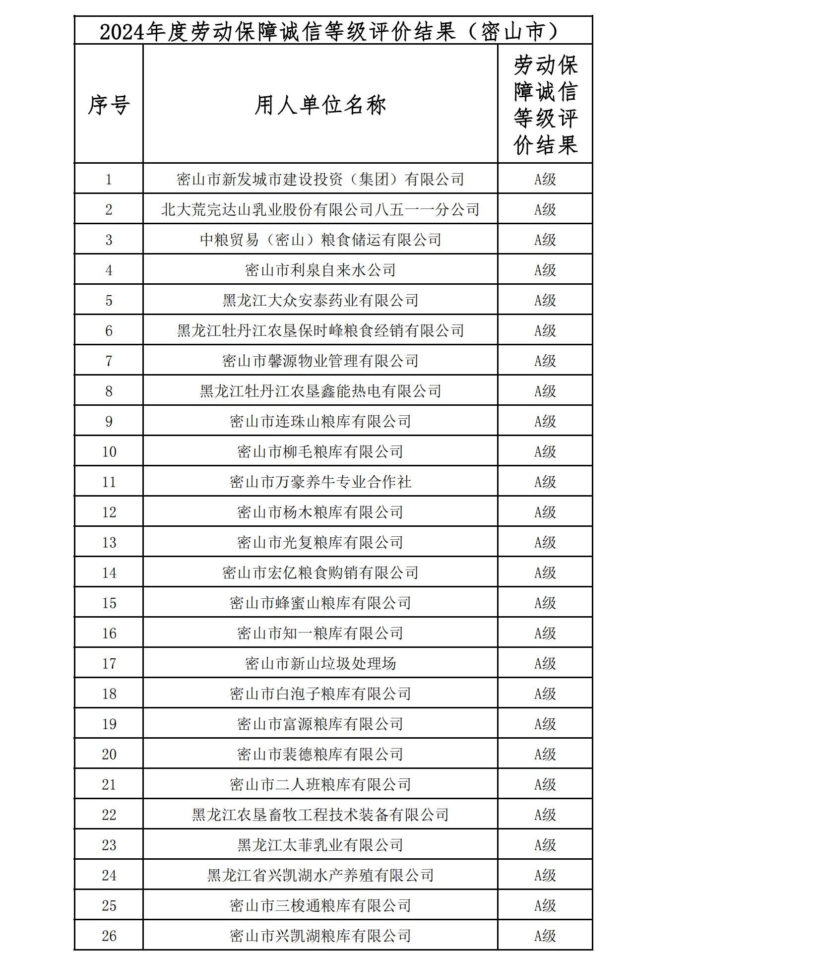 根据《黑龙江省企业劳动保障诚信等级评价实施办法》规定及市优化营商环境守信践诺专班要求,在全市范围内组织开展2024年劳动保障书面审查和诚信等级评价工作。经申报、审核、征求意见等程序,现将2024年市本级用人单位劳动保障诚信等级评价结果公示如下:
