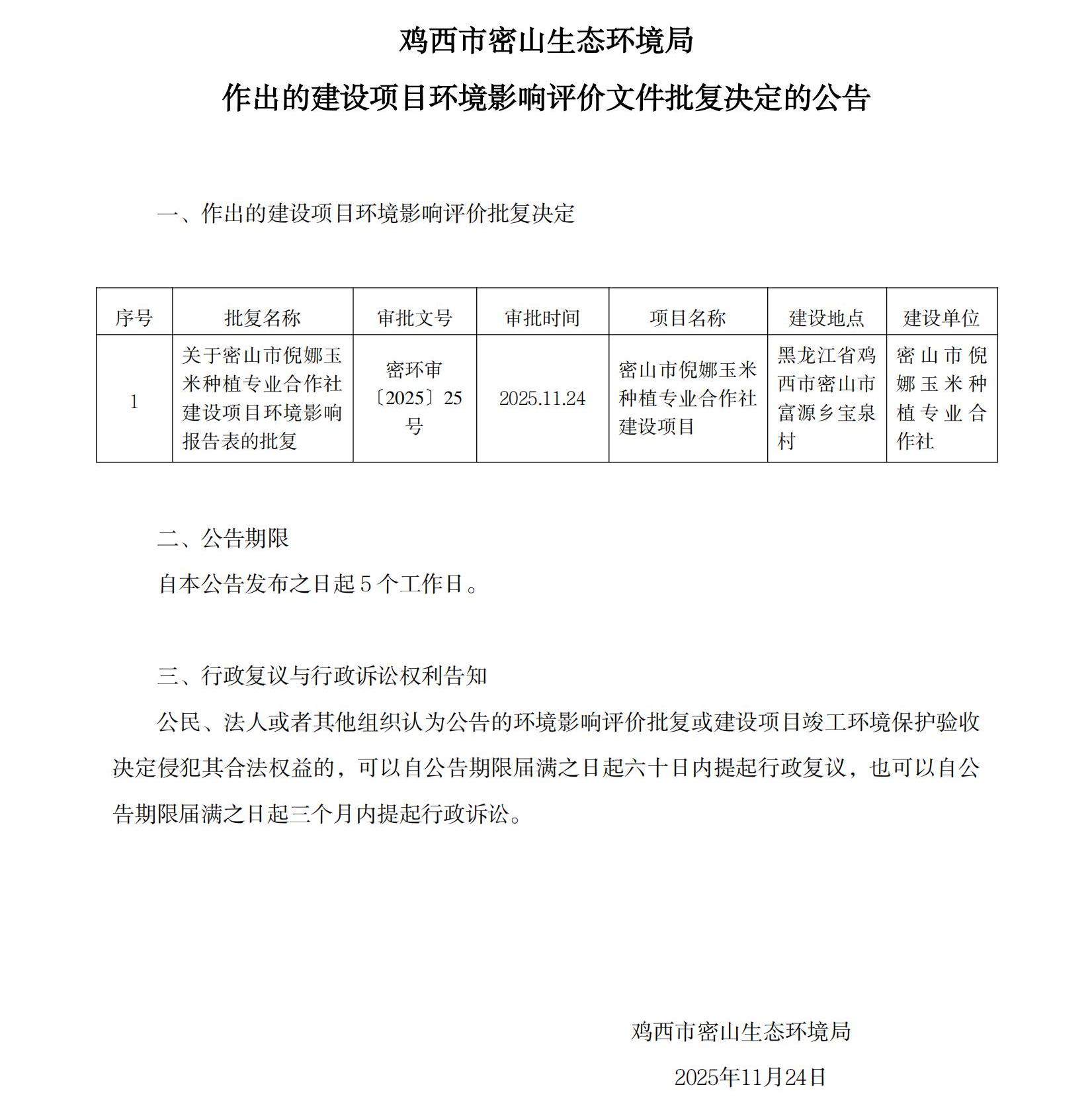 鸡西市密山生态环境局作出的建设项目环境影响评价文件批复决定的公告