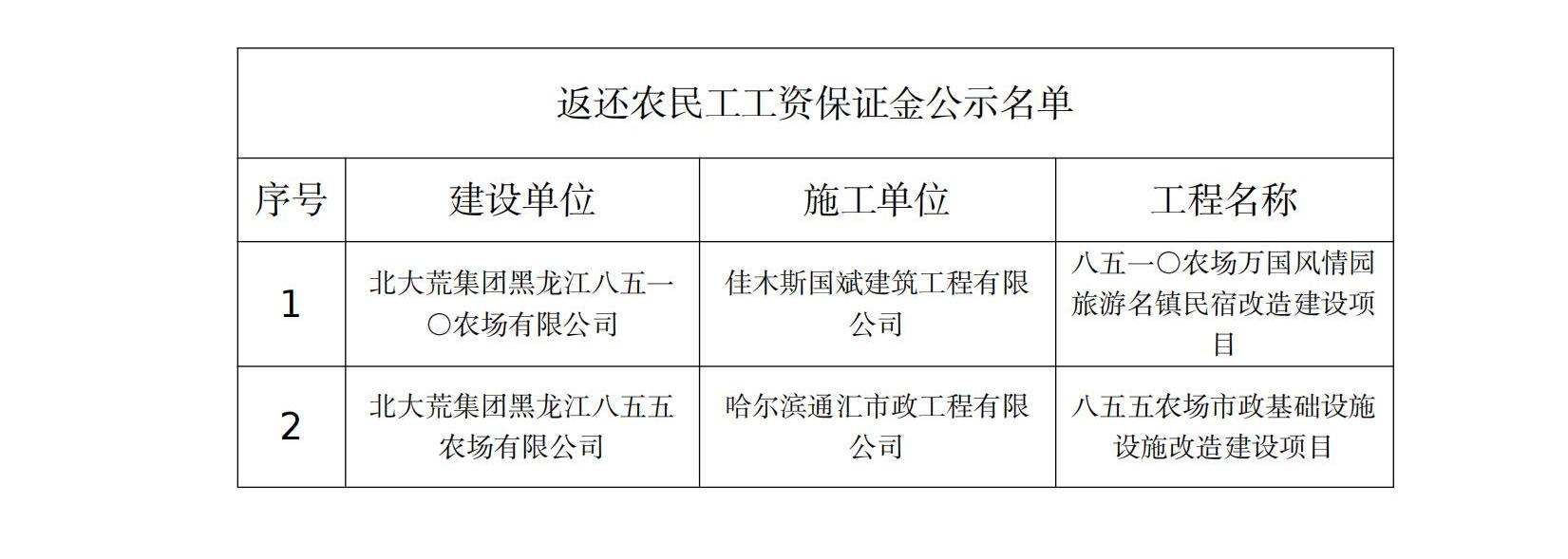 根据《工程建设领域农民工工资保证金规定》(人社部发〔2021〕65号)文件要求,现对返还农民工工资保证金的2个工程进行公示,如工程项目中有存在拖欠农民工工资行为的,请及时到密山市人力资源和社会保障局劳动监察部门举报投诉。公示期满,如不存在工资拖欠问题投诉举报的,密山市人力资源和社会保障局将按规定程序返还农民工工资保证金。
