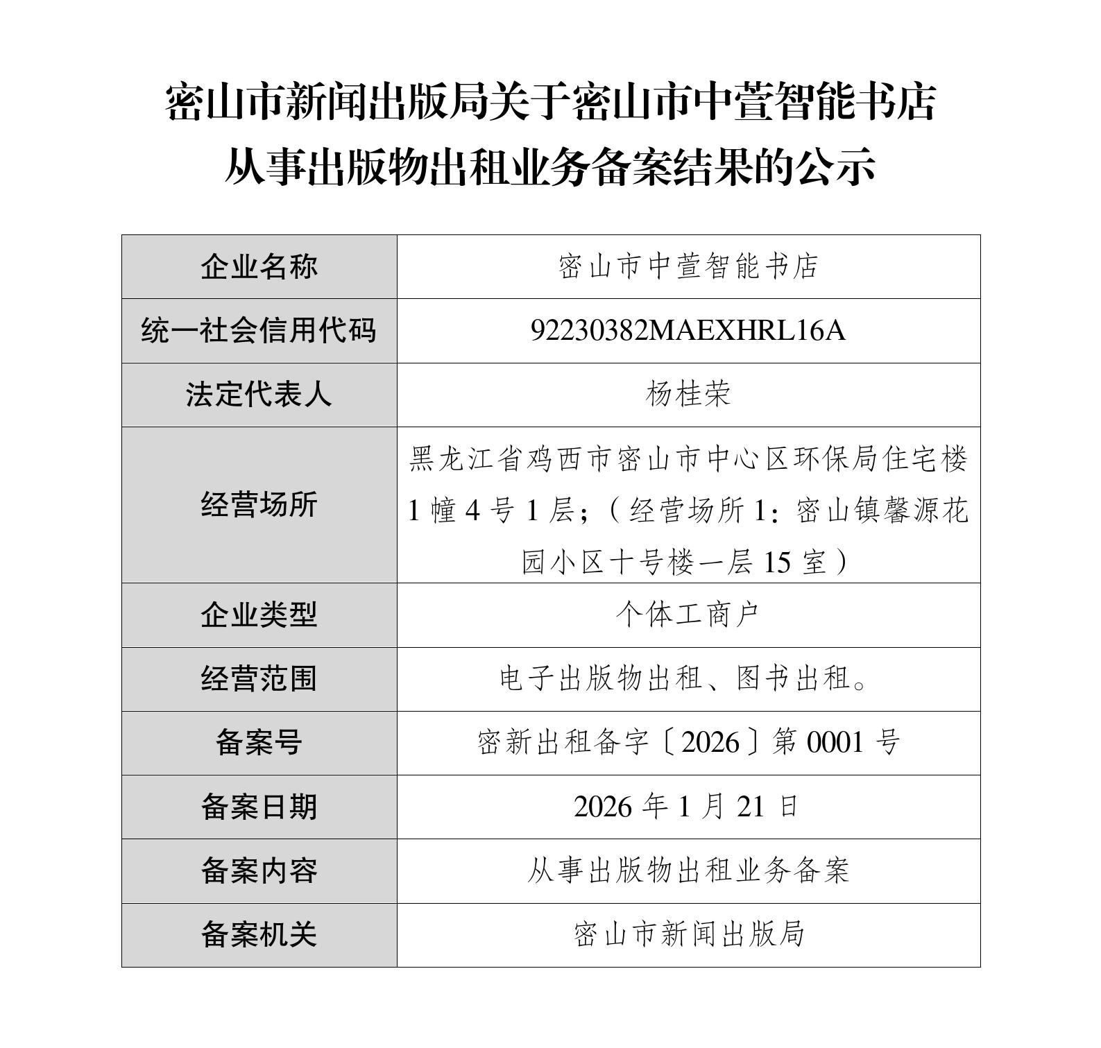 密山市新闻出版局关于密山市中萱智能书店从事出版物出租业务备案结果的公示