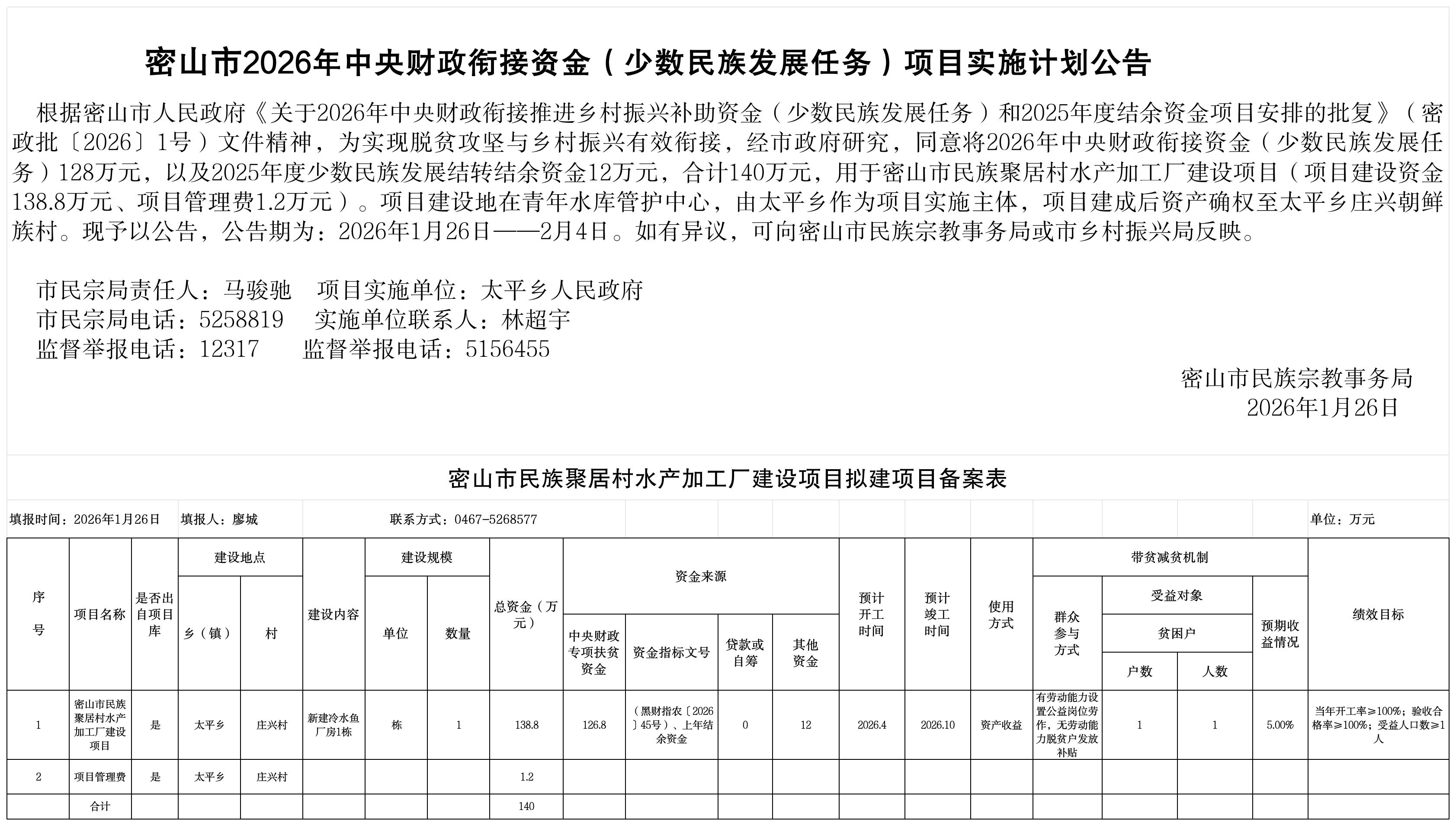 密山市2026年中央财政衔接资金(少数民族发展任务)项目实施计划公告