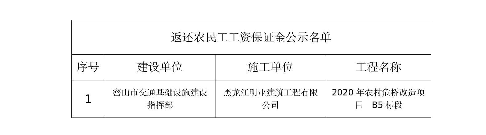 根据《工程建设领域农民工工资保证金规定》(人社部发〔2021〕65号)文件要求,现对返还农民工工资保证金的1个工程进行公示,如该工程项目有存在拖欠农民工工资行为,请及时到密山市人力资源和社会保障局劳动监察部门举报投诉。公示期满后,如不存在工资拖欠问题投诉举报的,密山市人力资源和社会保障局将按规定程序返还农民工工资保证金。