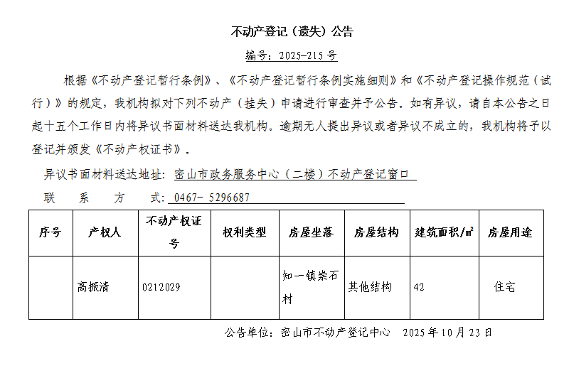 不动产登记(遗失)公告编号:2025-高振清