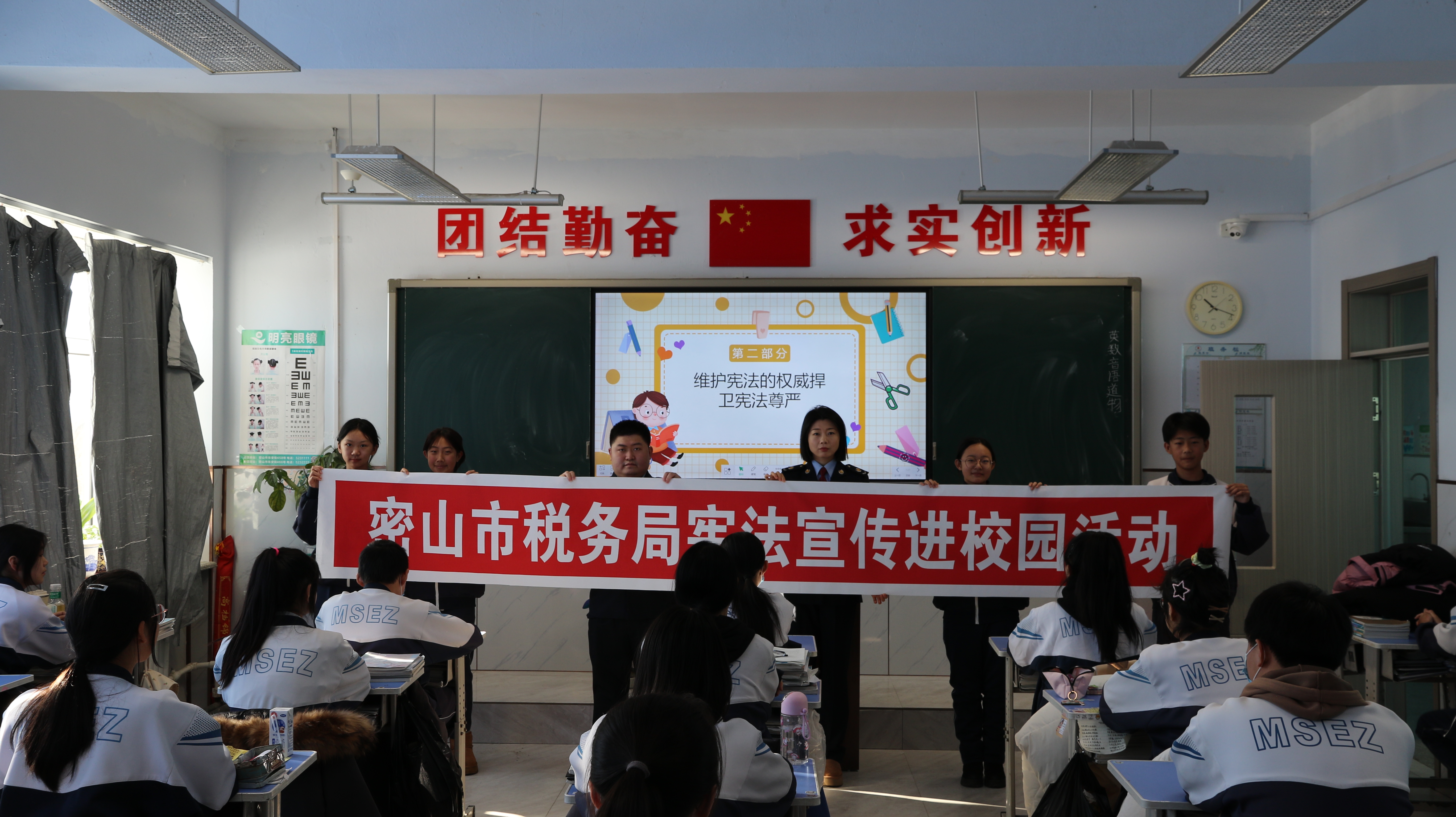为大力弘扬宪法精神,引导学生做宪法的忠实崇尚者、自觉遵守者、坚定捍卫者,在第十二个国家宪法日期间,密山市税务局走进密山市第二中学开展送宪法进校园活动。