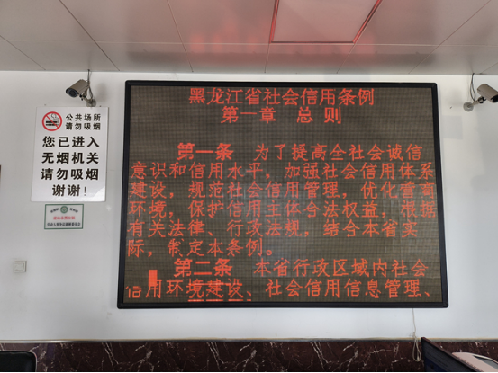 在宣传工作中,工作人员结合日常办事场景,向群众讲解诚信在个人生活、经济活动及社会交往中的关键作用。耐心解答了群众关于信用修复、信用查询的疑问,引导群众珍惜个人信用记录,积极参与诚信建设。同时,通过在便民服务中心显示屏滚动播放《黑龙江省社会信用条例》,进一步强化诚信宣传氛围。