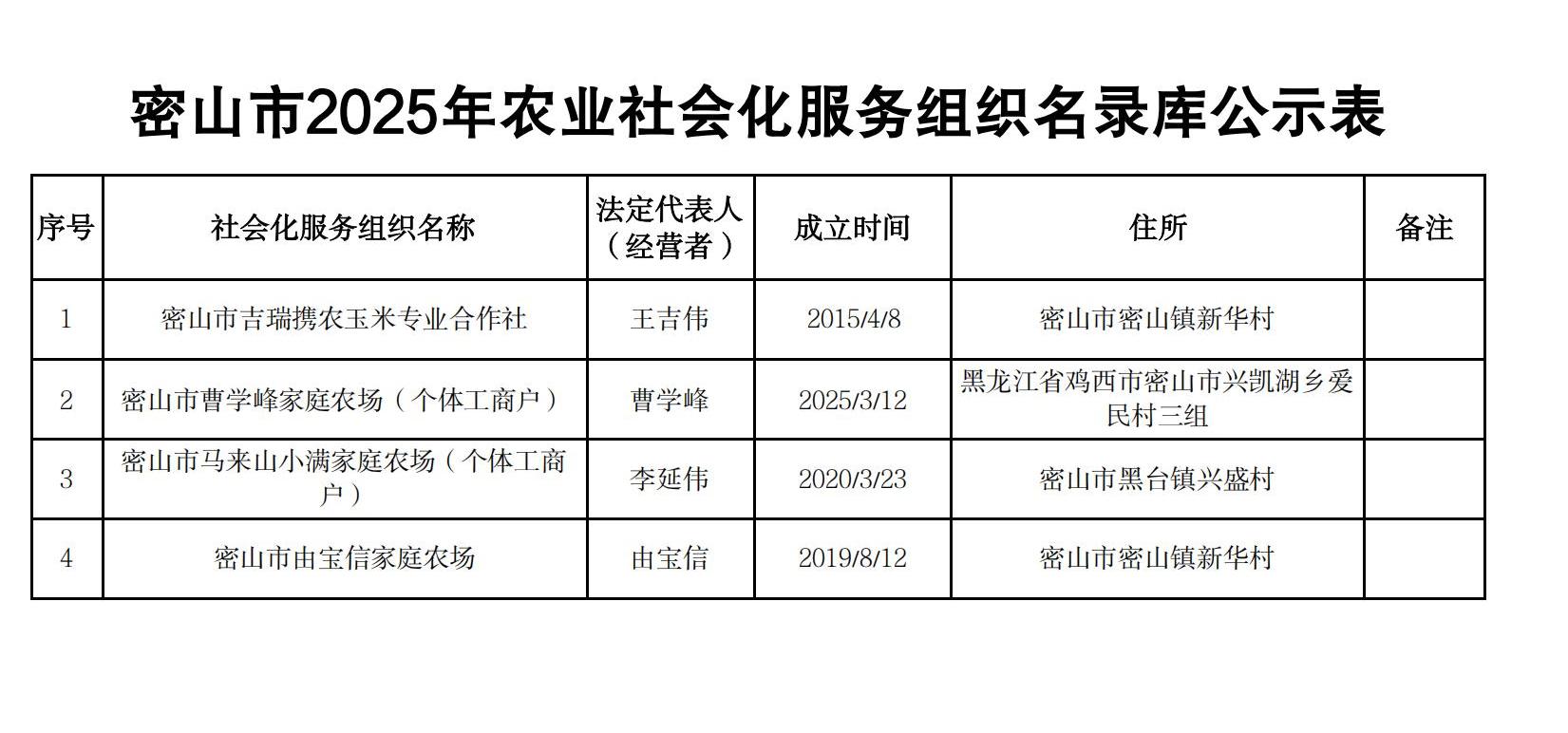 为了确保我市2025年农业社会化服务项目顺利完成,市农业农村局现对社会化服务组织名录库名单进行公示,公示期为2025年10月27日-2025年11月2日。有异议者,及时以书面或口头方式向密山市农业农村局反映。接待时间:周一至周五8:30--12:00,13:30--17:00,联系电话:0467-5200697。