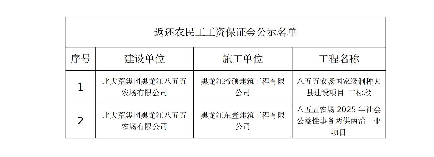 根据《工程建设领域农民工工资保证金规定》(人社部发〔2021〕65号)文件要求,现对返还农民工工资保证金的2个工程进行公示,如工程项目中有存在拖欠农民工工资行为的,请及时到密山市人力资源和社会保障局劳动监察部门举报投诉。公示期满,如不存在工资拖欠问题投诉举报的,密山市人力资源和社会保障局将按规定程序返还农民工工资保证金。