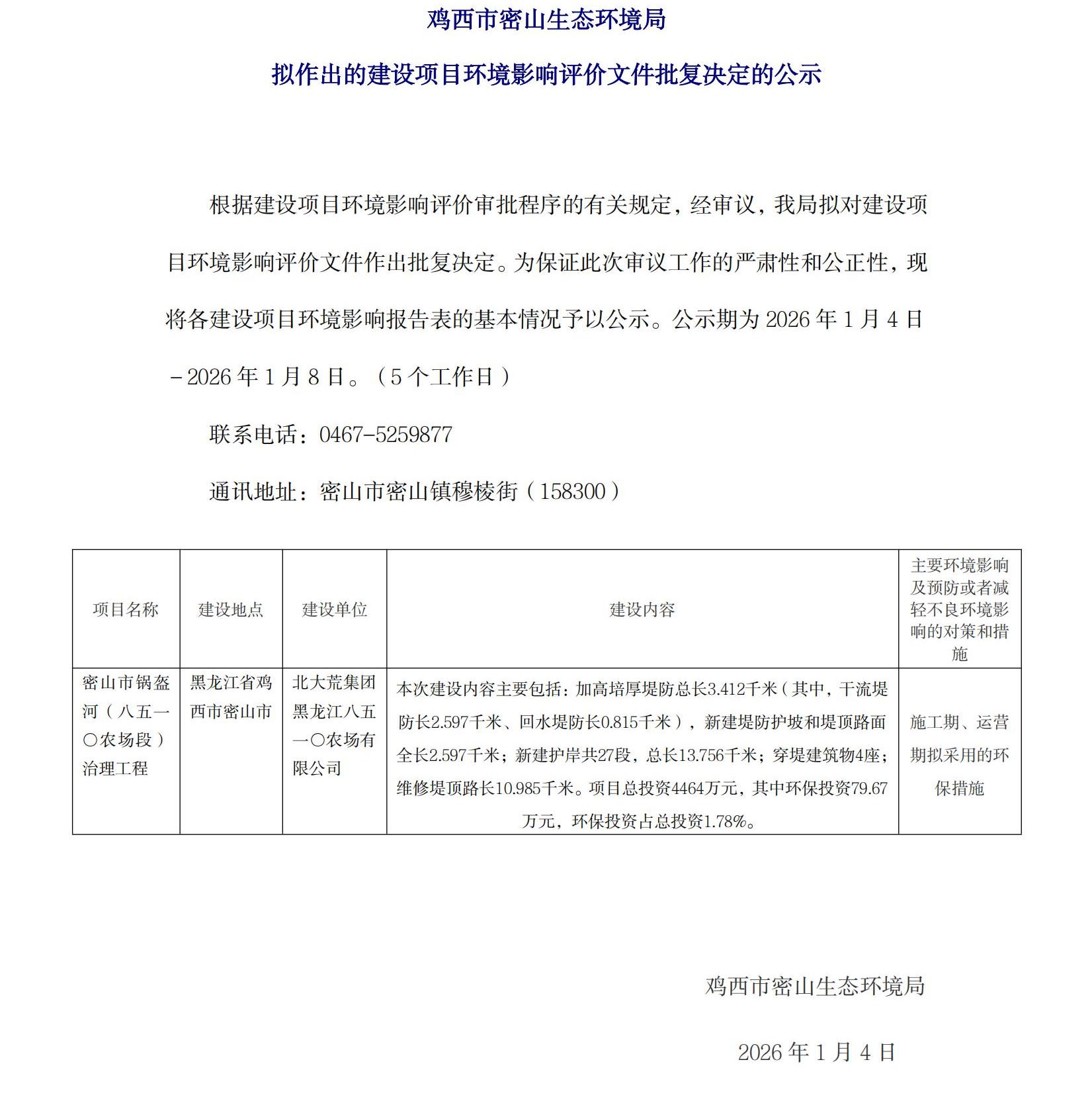 鸡西市密山生态环境局拟作出的建设项目环境影响评价文件批复决定的公示