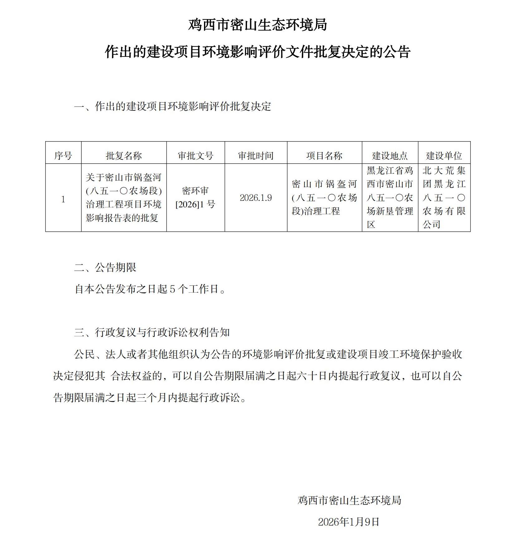 鸡西市密山生态环境局作出的建设项目环境影响评价文件批复决定的公告