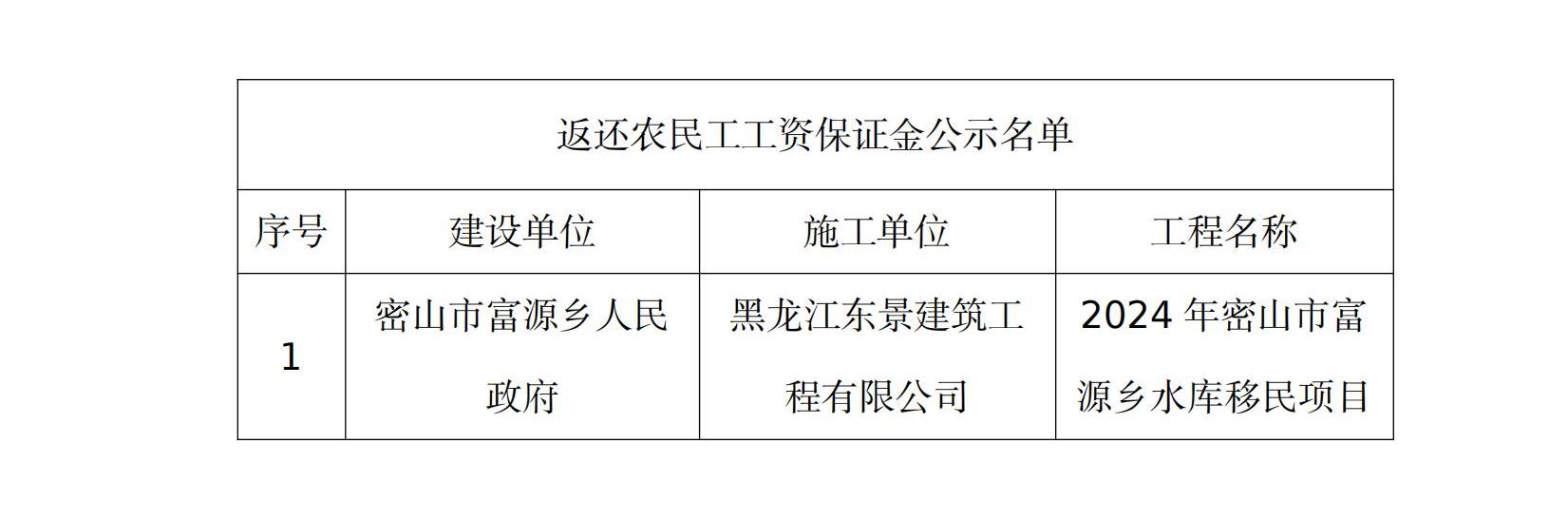 根据《工程建设领域农民工工资保证金规定》(人社部发〔2021〕65号)文件要求,现对返还农民工工资保证金的1个工程进行公示,如工程项目中有存在拖欠农民工工资行为的,请及时到密山市人力资源和社会保障局劳动监察部门举报投诉。公示期满后,如不存在工资拖欠问题投诉举报的,密山市人力资源和社会保障局将按规定程序返还农民工工资保证金。