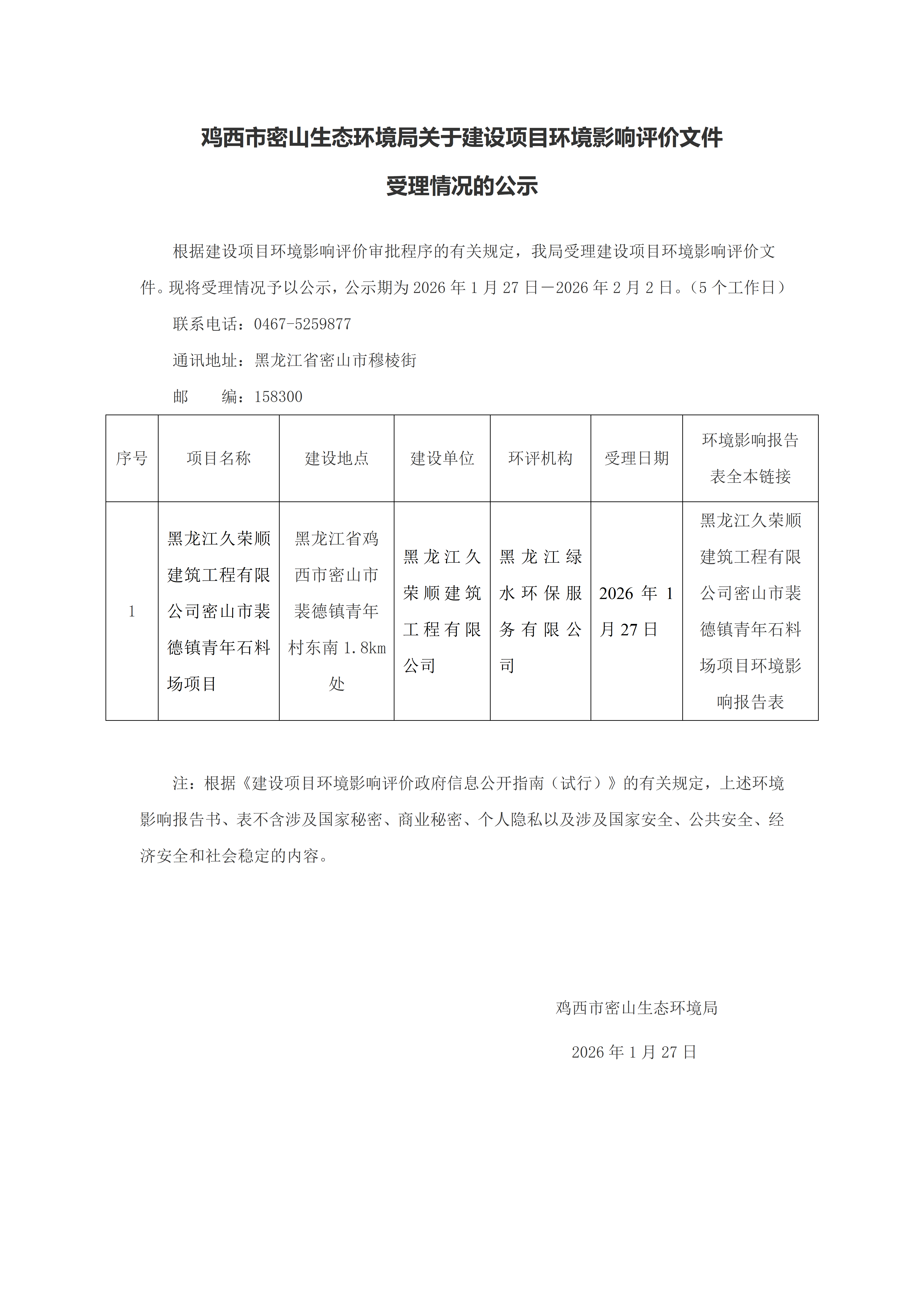黑龙江久荣顺建筑工程有限公司密山市裴德镇青年石料场项目环境影响报告表
