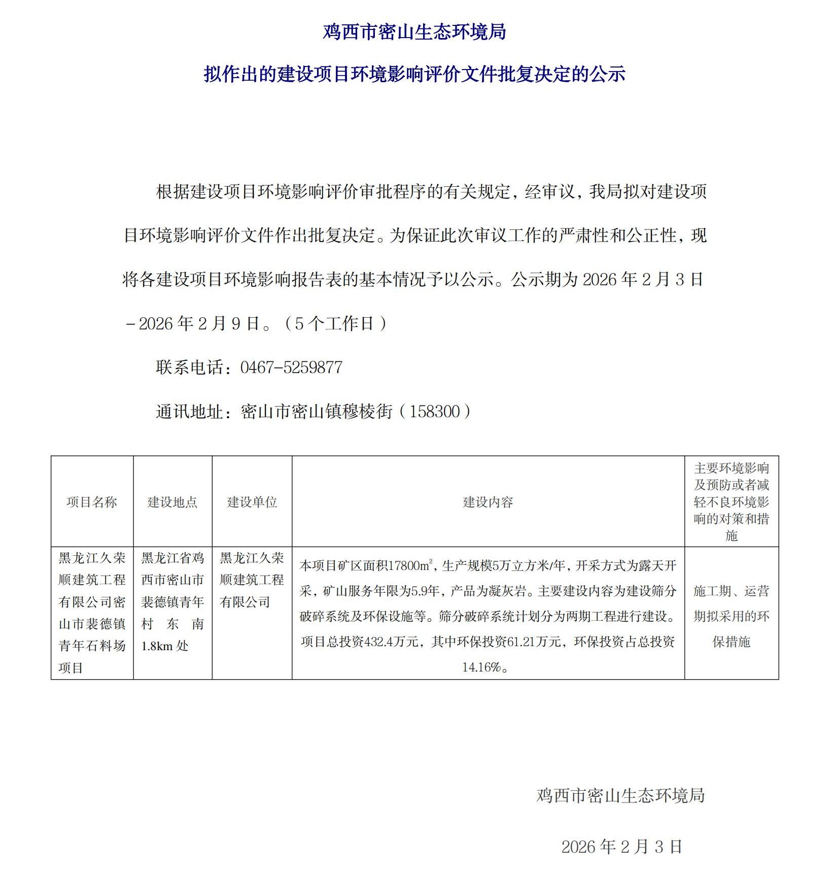 鸡西市密山生态环境局拟作出的建设项目环境影响评价文件批复决定的公示