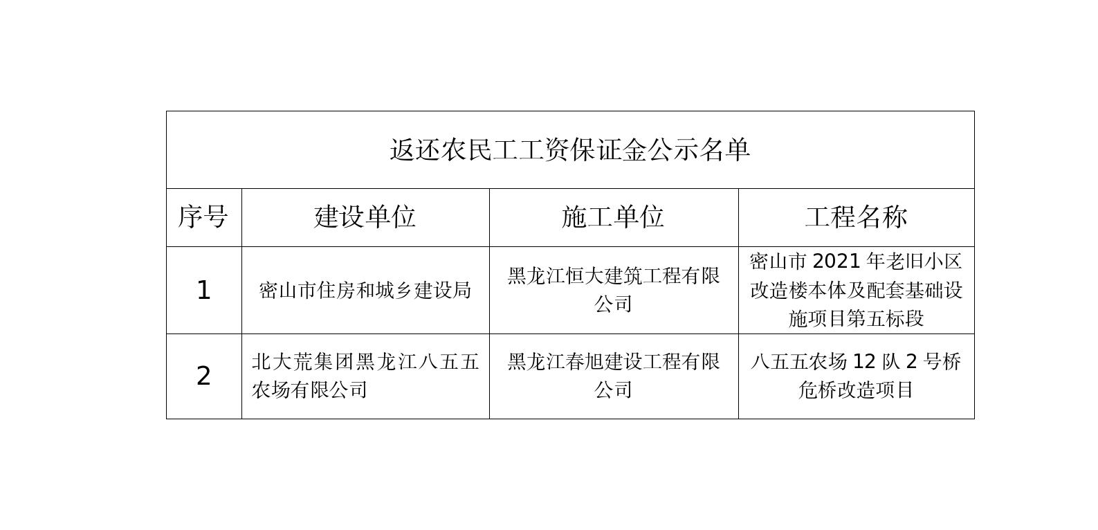 根据《工程建设领域农民工工资保证金规定》(人社部发〔2021〕65号)文件要求,现对返还农民工工资保证金的2个工程进行公示,如该工程项目中有存在拖欠农民工工资行为,请及时到密山市人力资源和社会保障局劳动监察部门举报投诉。公示期满后,如不存在工资拖欠问题投诉举报的,密山市人力资源和社会保障局将按规定程序返还农民工工资保证金。