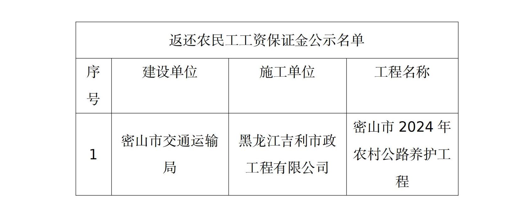 根据《工程建设领域农民工工资保证金规定》(人社部发〔2021〕65号)文件要求,现对返还农民工工资保证金的1个工程进行公示,如工程项目中有存在拖欠农民工工资行为的,请及时到密山市人力资源和社会保障局劳动监察部门举报投诉。公示期满后,如不存在工资拖欠问题投诉举报的,密山市人力资源和社会保障局将按规定程序返还农民工工资保证金。