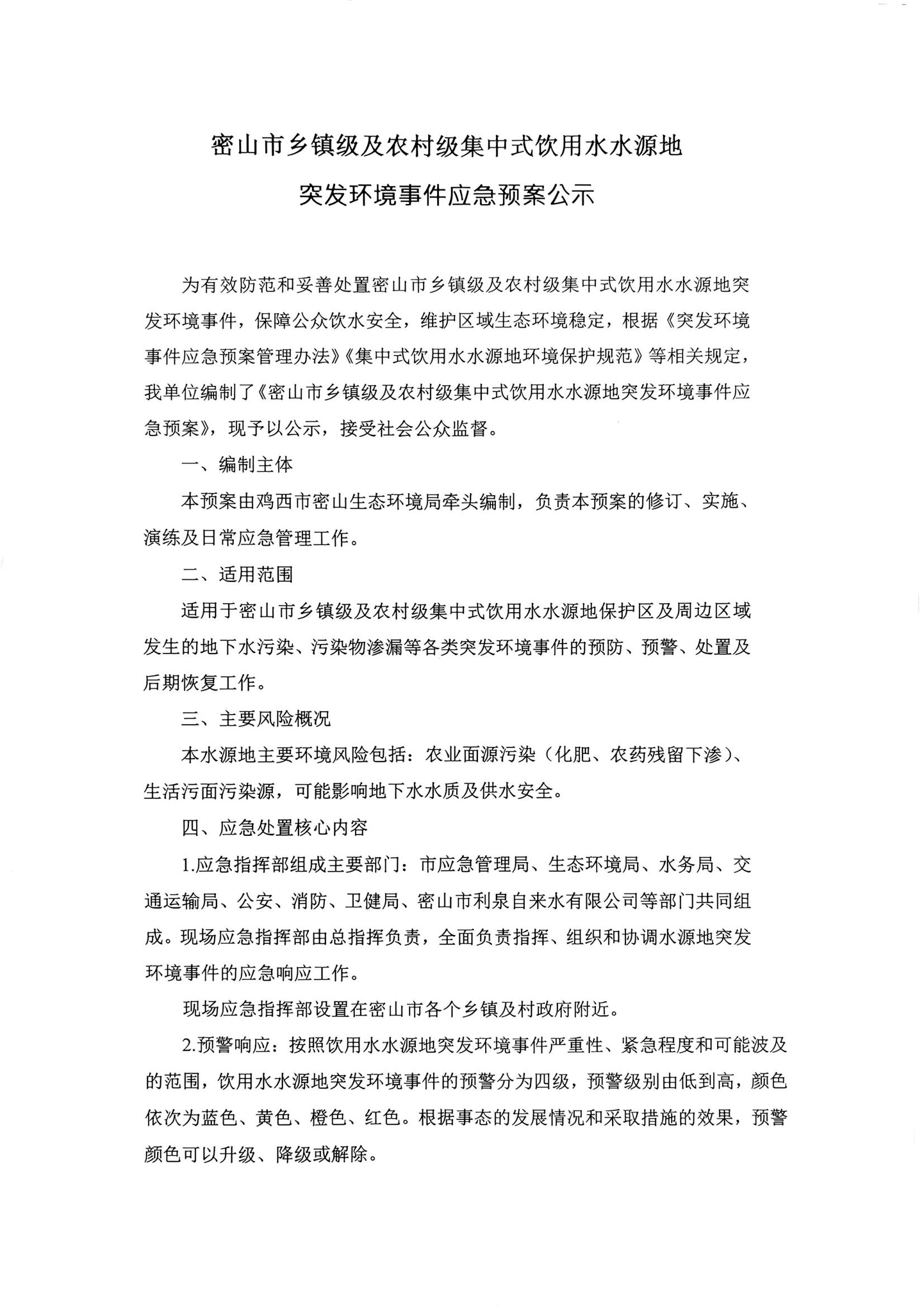 密山市乡镇级及农村级集中式饮用水水源地突发环境事件应急预案公示
