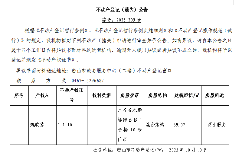 不动产登记(遗失)公告编号:2025-魏晓慧