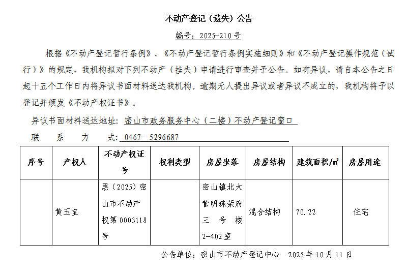 不动产登记(遗失)公告编号:2025-黄玉宝