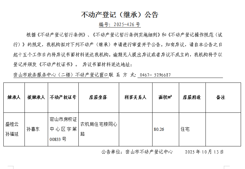 不动产登记(继承)公告编号:2025-盛桂云、孙福延