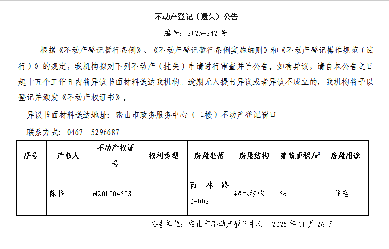 不动产登记(遗失)公告编号:2025-242陈静