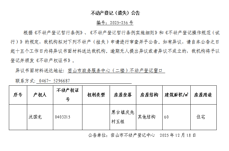 不动产登记(遗失)公告编号:2025-256沈国龙