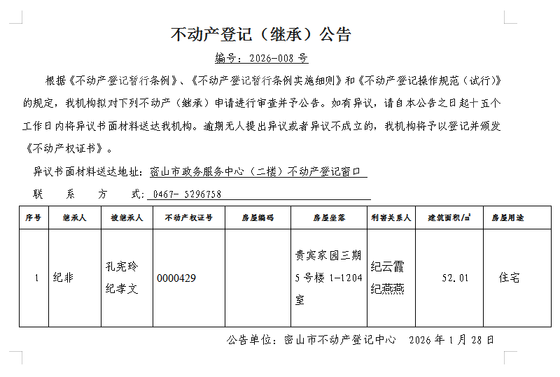 不动产登记(继承)公告编号:2026-纪非