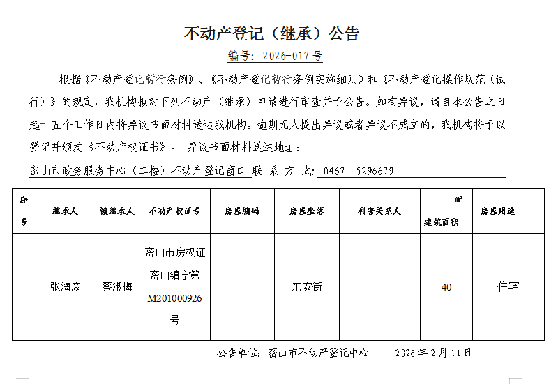不动产登记(继承)公告编号:2026-张海彦