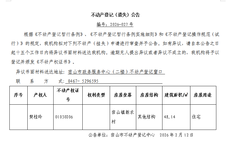 不动产登记(遗失)公告编号:2026-027樊桂玲