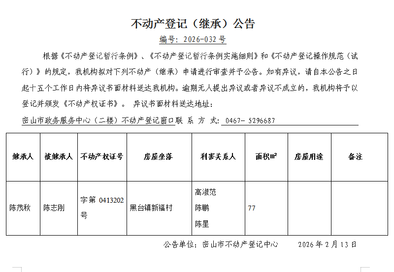 不动产登记(继承)公告编号:2026-陈茂秋