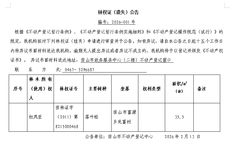 林权证(遗失)公告编号:2026-001杜凤臣