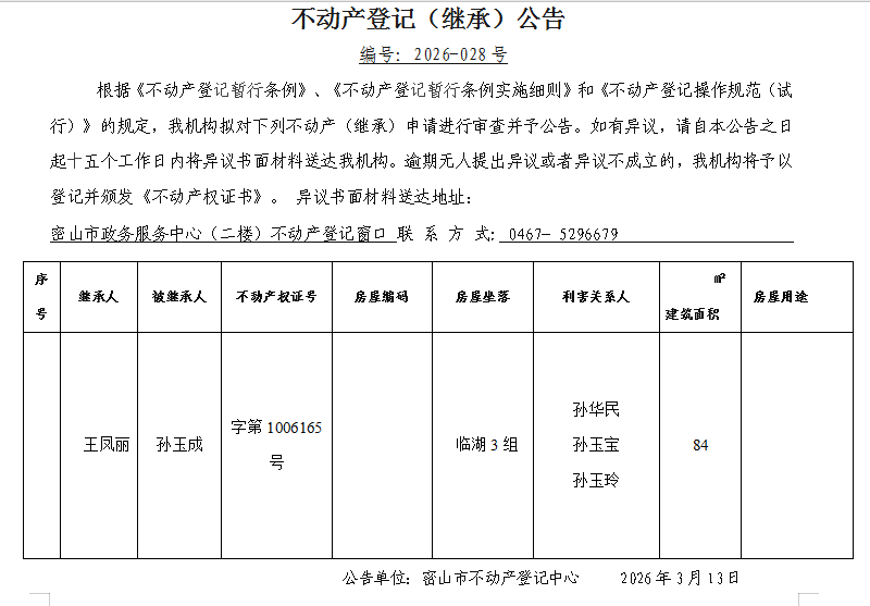不动产登记(继承)公告编号:2026-王凤丽
