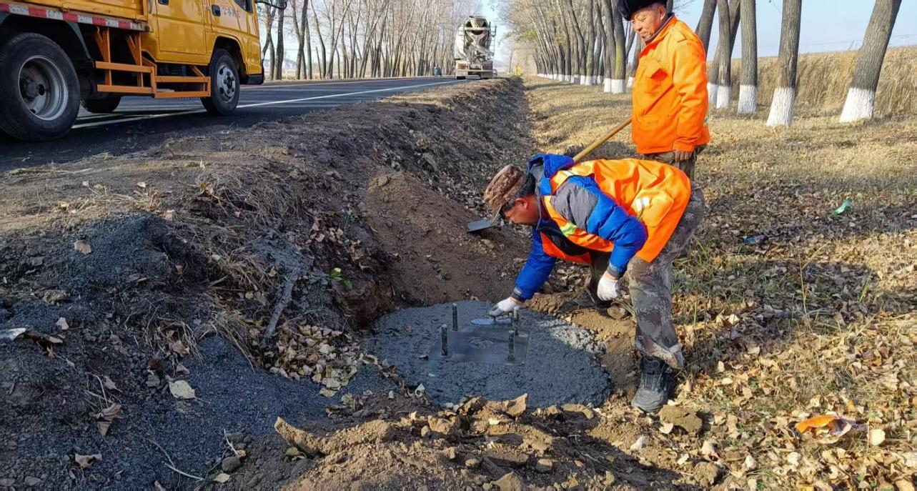 10月17日,中心组织专业人员开展全面隐患排查,重点检查沿线村屯道口、急弯、陡坡的警示标识,尤其紧盯交通事故多发路段,记录隐患问题以明确整改方向。10月17日至20日,针对需增设标识的点位,加急制作并严控钢筋混凝土预制件质量,做好安装前期准备。10月21日,预制件达标后启动安装,施工人员高效推进。截至10月23日,共安装各类安全警示标识77个,含爆闪灯13处26个、急弯陡坡标识6个、弯道导向标志3处40个、哨兵指示牌5个。