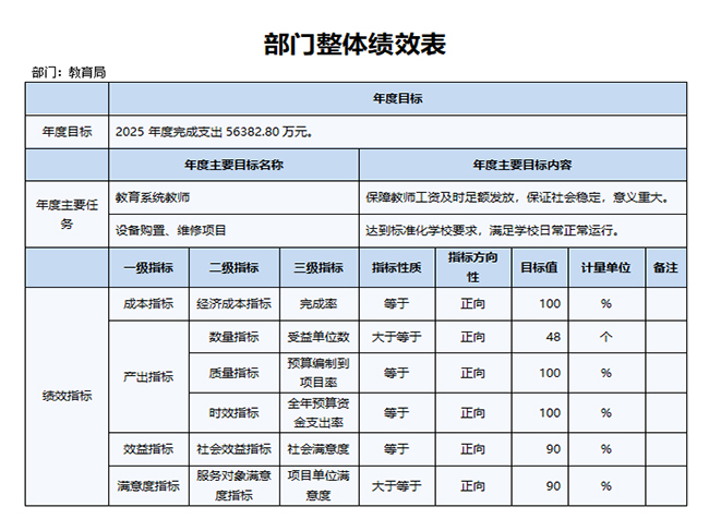 2025年,密山市教育局部门年度绩效目标为:按照密山市教育局全年工作要点计划安排,努力办好人民满意的教育,实现教育公平,构建和谐社会,建立教育强市;改善学校办学条件,更新教学设备,提升教学设备质量,维修加固校舍,消除安全隐患,解决冬季取暖等问题,为办好真正的教育,给学生一个好的学习生活环境。2025年密山市教育局对30所公办学校进行维修改造,其中:义务教育学校7所,幼儿园23所。主要维修内容有:采暖系统改造、外墙改造、内外墙粉刷、铺设沥青篮球场及甬路、给排水维修等。校舍维修面积约63301平方米,铺设沥青篮球场、马路砖及硬化面积约26901.84平方米。为12所义务教育学校采购安装了录播教室设备,为25所幼儿园采购了玩教具及更新办公设备;为1所学校采购安装电采暖设备;为乡镇初中更新18所实验室;合理完成学生营养餐计划,保障全市学生的身体健康。教育经费足额拨付32所单位,保证全市教育系统各学校开展日常教育教学活动所需要的人员经费基本开支,保证离退休人员的基本工资福利,提高幸福指数,稳定社会大环境,为尽快达到小康生活水平而努力。促进我市教育均衡发展100%、家长社会满意度90%等。