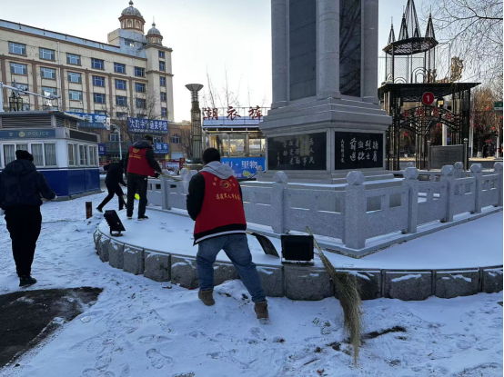 尽管寒风凛冽,却吹不散大家心中的热忱,市退役军人事务局的志愿者们俯身清扫台阶积雪,细致擦拭塔体浮雕,清除基座周围的冰凌杂物,经过大家几个小时的努力,纪念塔周身的积雪被彻底清理干净。