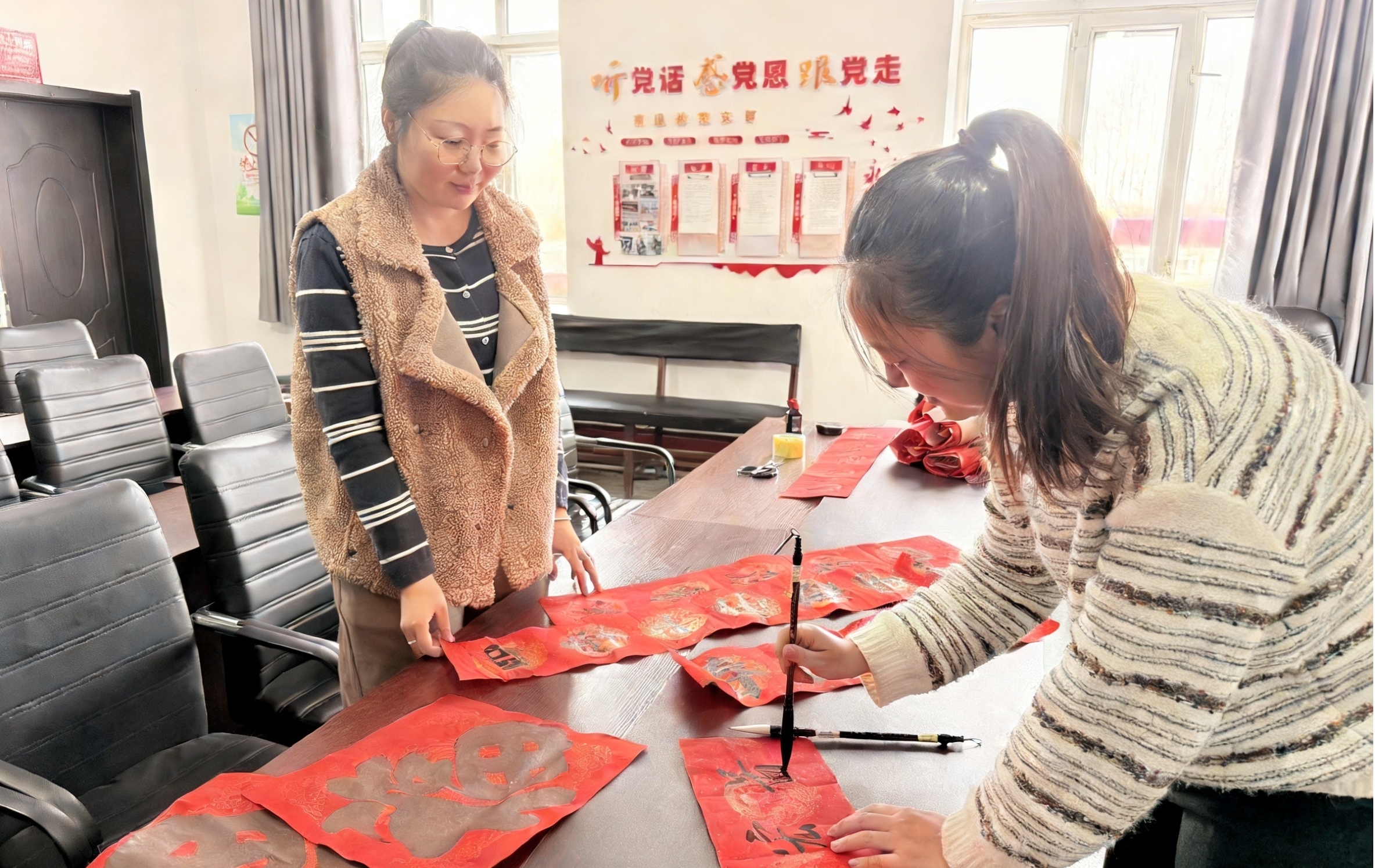 活动现场暖意融融,长桌铺展着大红春联纸,墨汁的清香与红纸的喜庆相互交织。青年们热情高涨,提笔蘸墨、凝神书写,一笔一画临摹“福”字与春联。