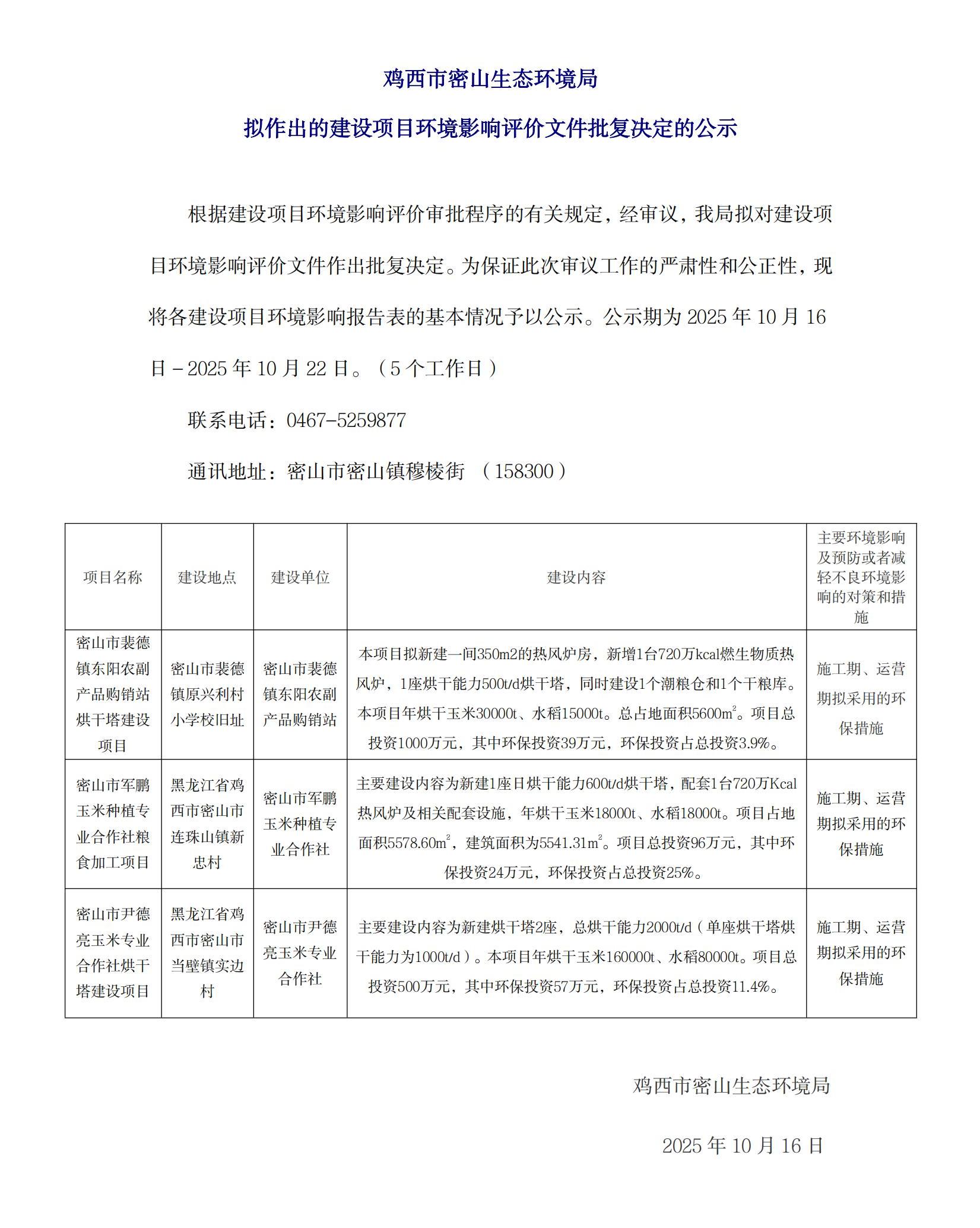 鸡西市密山生态环境局拟作出的建设项目环境影响评价文件批复决定的公示