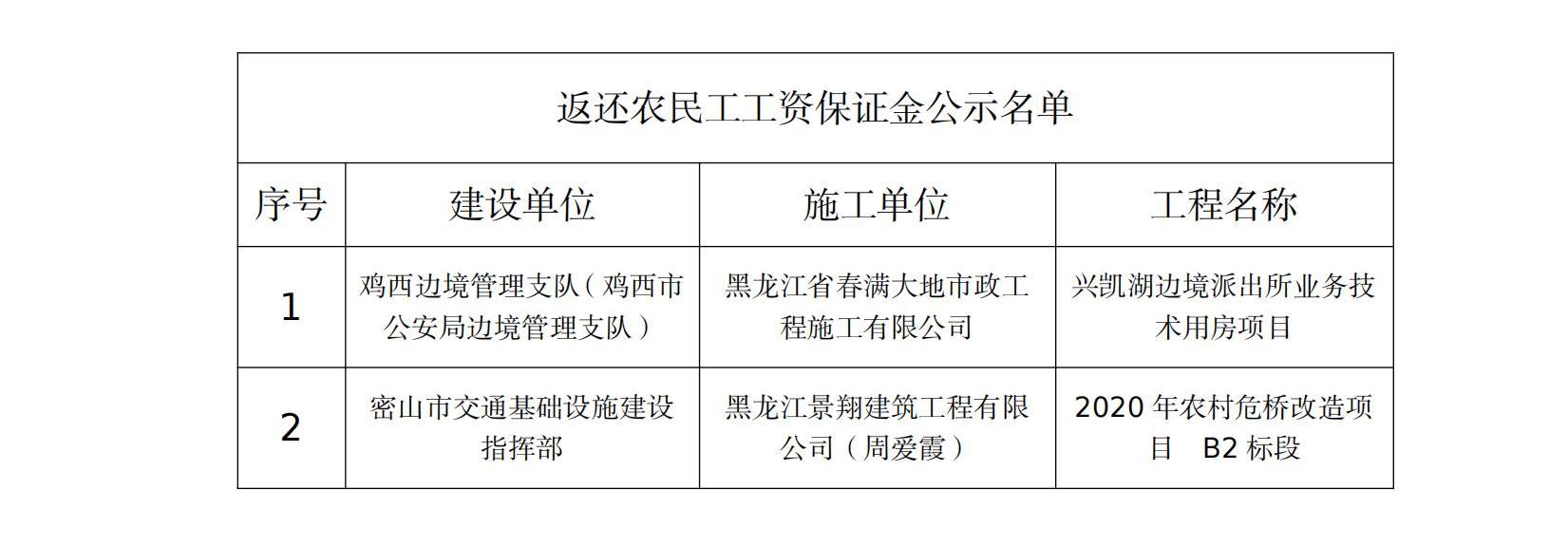 根据《工程建设领域农民工工资保证金规定》(人社部发〔2021〕65号)文件要求,现对返还农民工工资保证金的2个工程进行公示,如工程项目中有存在拖欠农民工工资行为的,请及时到密山市人力资源和社会保障局劳动监察部门举报投诉。公示期满后,如不存在工资拖欠问题投诉举报的,密山市人力资源和社会保障局将按规定程序返还农民工工资保证金。