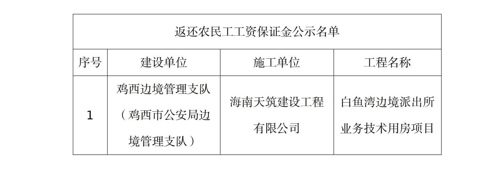 根据《工程建设领域农民工工资保证金规定》(人社部发〔2021〕65号)文件要求,现对返还农民工工资保证金的1个工程进行公示,如工程项目中有存在拖欠农民工工资行为的,请及时到密山市人力资源和社会保障局劳动监察部门举报投诉。公示期满后,如不存在工资拖欠问题投诉举报的,密山市人力资源和社会保障局将按规定程序返还农民工工资保证金。