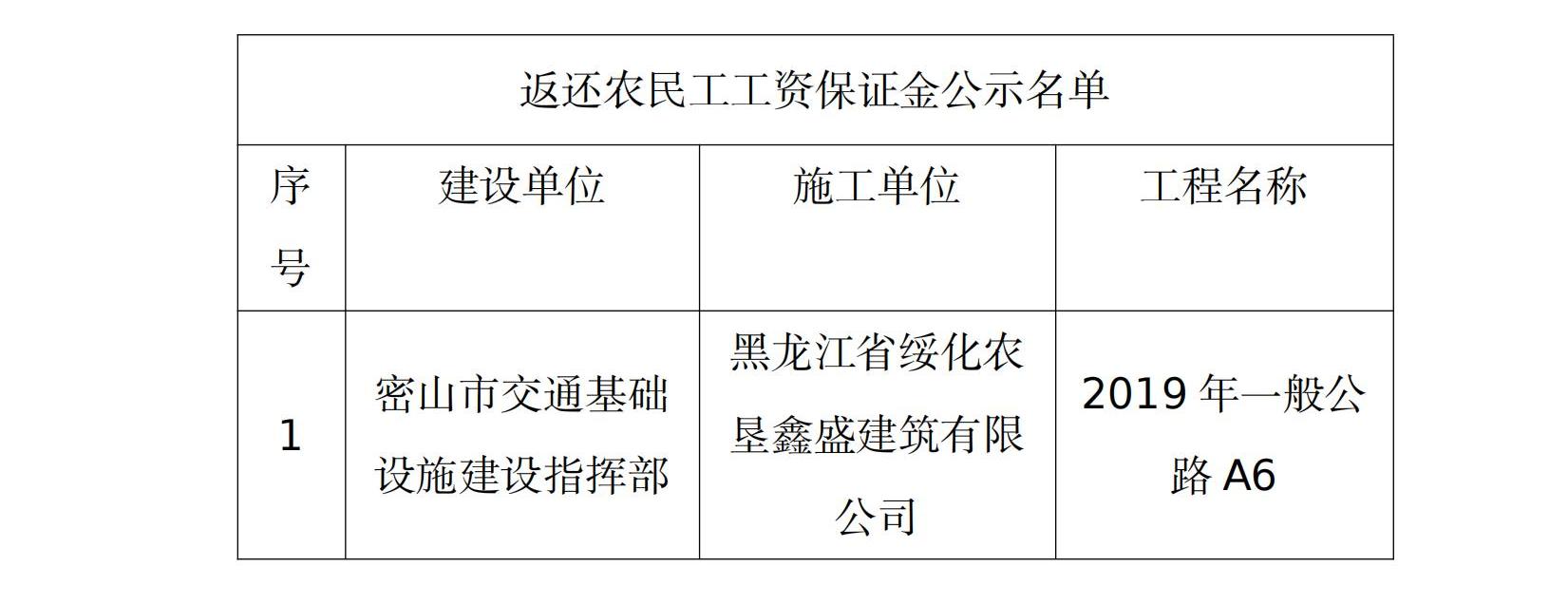 根据《工程建设领域农民工工资保证金规定》(人社部发〔2021〕65号)文件要求,现对返还农民工工资保证金的1个工程进行公示,如工程项目中有存在拖欠农民工工资行为的,请及时到密山市人力资源和社会保障局劳动监察部门举报投诉。公示期满后,如不存在工资拖欠问题投诉举报的,密山市人力资源和社会保障局将按规定程序返还农民工工资保证金。