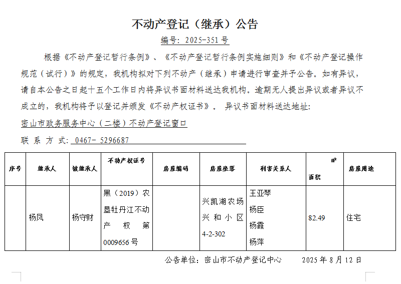 不动产登记(继承)公告编号:2025-杨凤