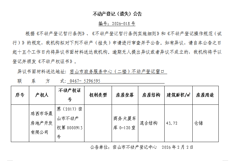 不动产登记(遗失)公告编号:2026-鸡西市华晨房地产开发有限公司