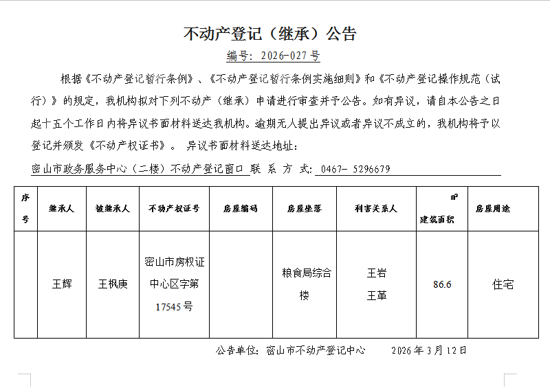 不动产登记(继承)公告编号:2026-王辉