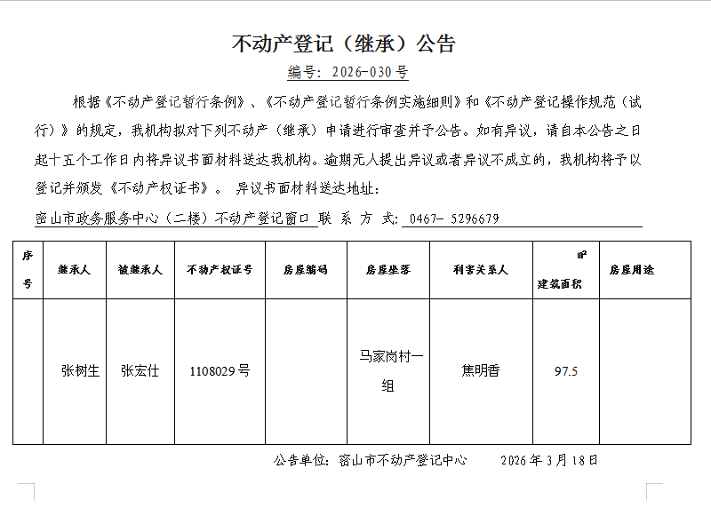 不动产登记(继承)公告编号:2026-张树生