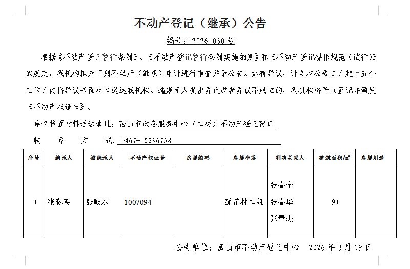 不动产登记(继承)公告编号:2026-张春英