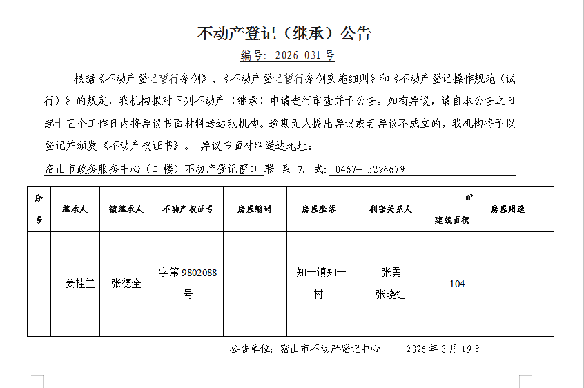 不动产登记(继承)公告编号:2026-姜桂兰